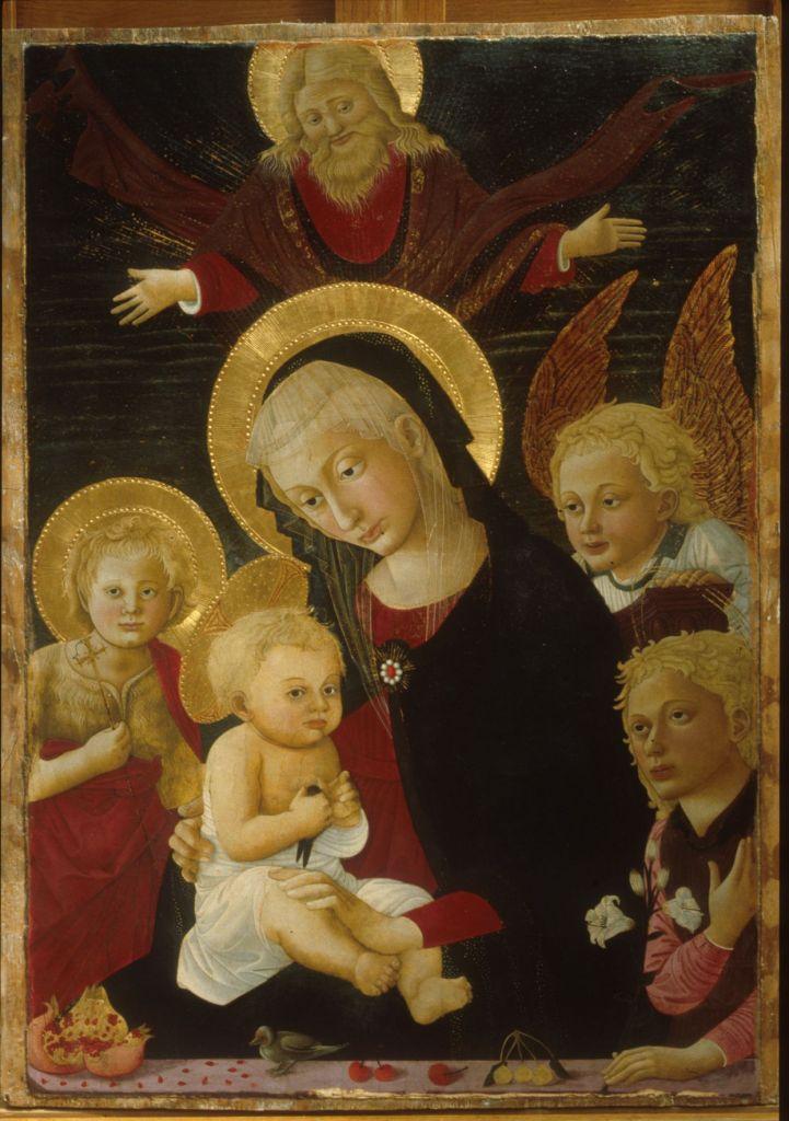 - Pseudo Pier Francesco Fiorentino , attribué à, La Vierge et l'Enfant avec le jeune saint Jean-Baptiste et deux anges sous la bénédiction du Père éternel, peinture (4e quart du 15e siècle - )
