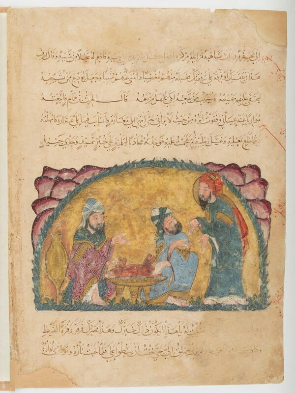 - Al-Ḥariri, Maqāmat, Abū Zayd, al-Hārith et son disciple, Paris, BnF, ms. Arabe 5847, f. 3v, manuscrit (1236 / 1237 - )