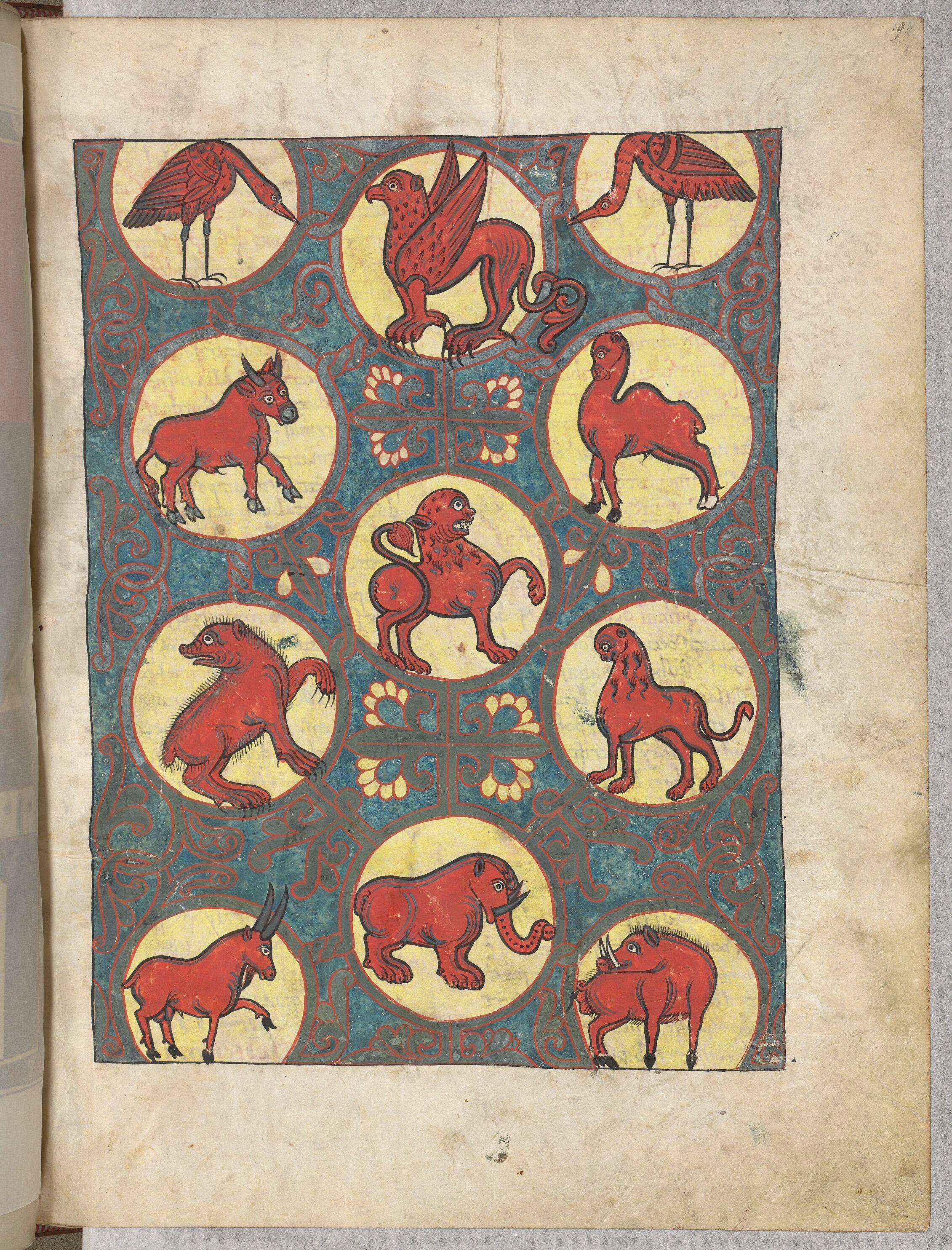 - Beatus de Saint-Sever, Médaillons avec des animaux, Paris, BnF, Latin 8878, f.198r, manuscrit (3e quart du 11e siècle - Avant 1072)