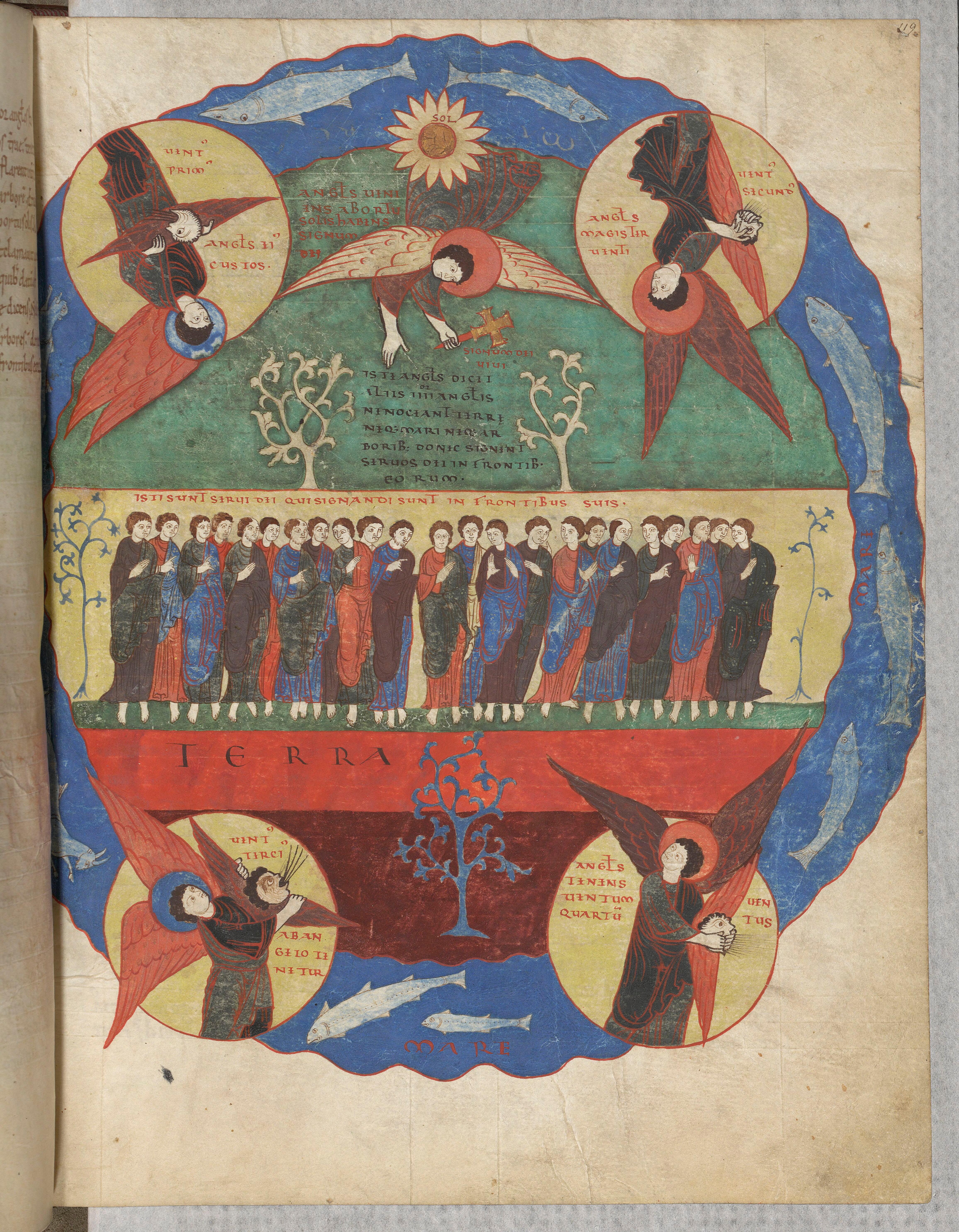 - Beatus de Saint-Sever, Quatre anges retenant les quatre vents, Paris, BnF, Latin 8878, f.119r, manuscrit (3e quart du 11e siècle - Avant 1072)