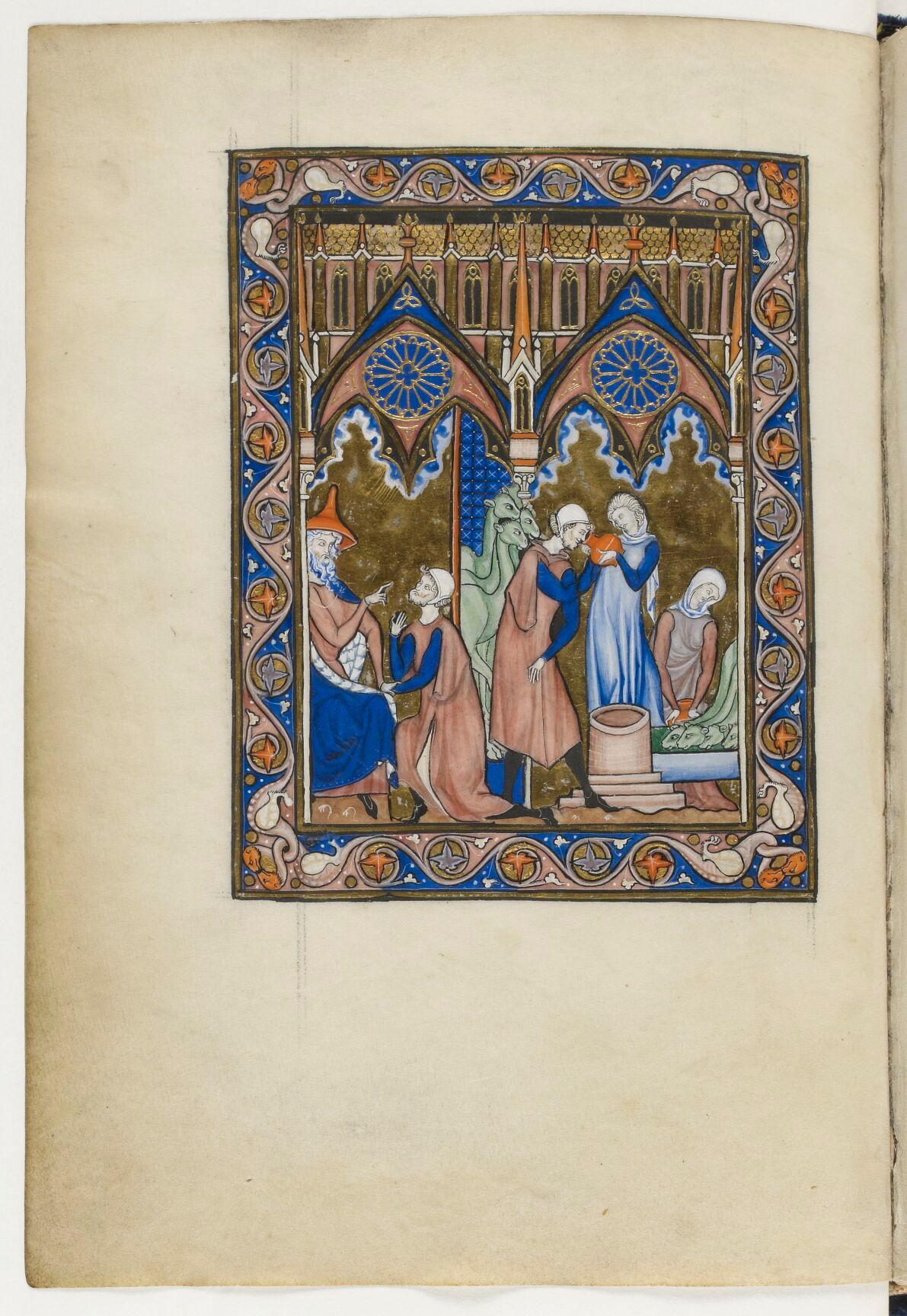 - Maître de Noah , peint par, Psautier de saint Louis, Abraham, Éliézer et Rébecca, Paris, BnF, Latin 10525, f.11v, manuscrit (1270 - 1274)