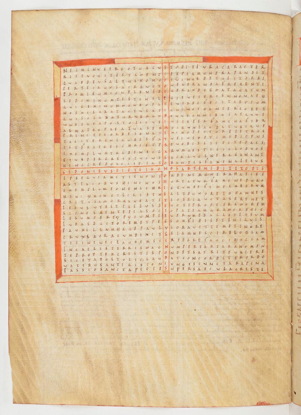 - Raban Maur, Louanges à la sainte croix, Croix, symbole des témoignages apostoliques, Paris, BnF Latin 2421, f.30v - orange - Couche colorée - couche picturale
