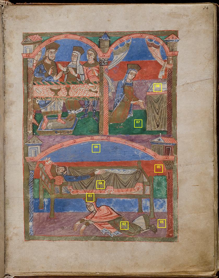 - Vie de Sainte Radegonde, Les noces de Radegonde. Radegonde en prière. Radegonde en prière, prosternée à côté du lit conjugal, Poitiers BM 250 (136) f. 24r - vert - Couche colorée - couche picturale
