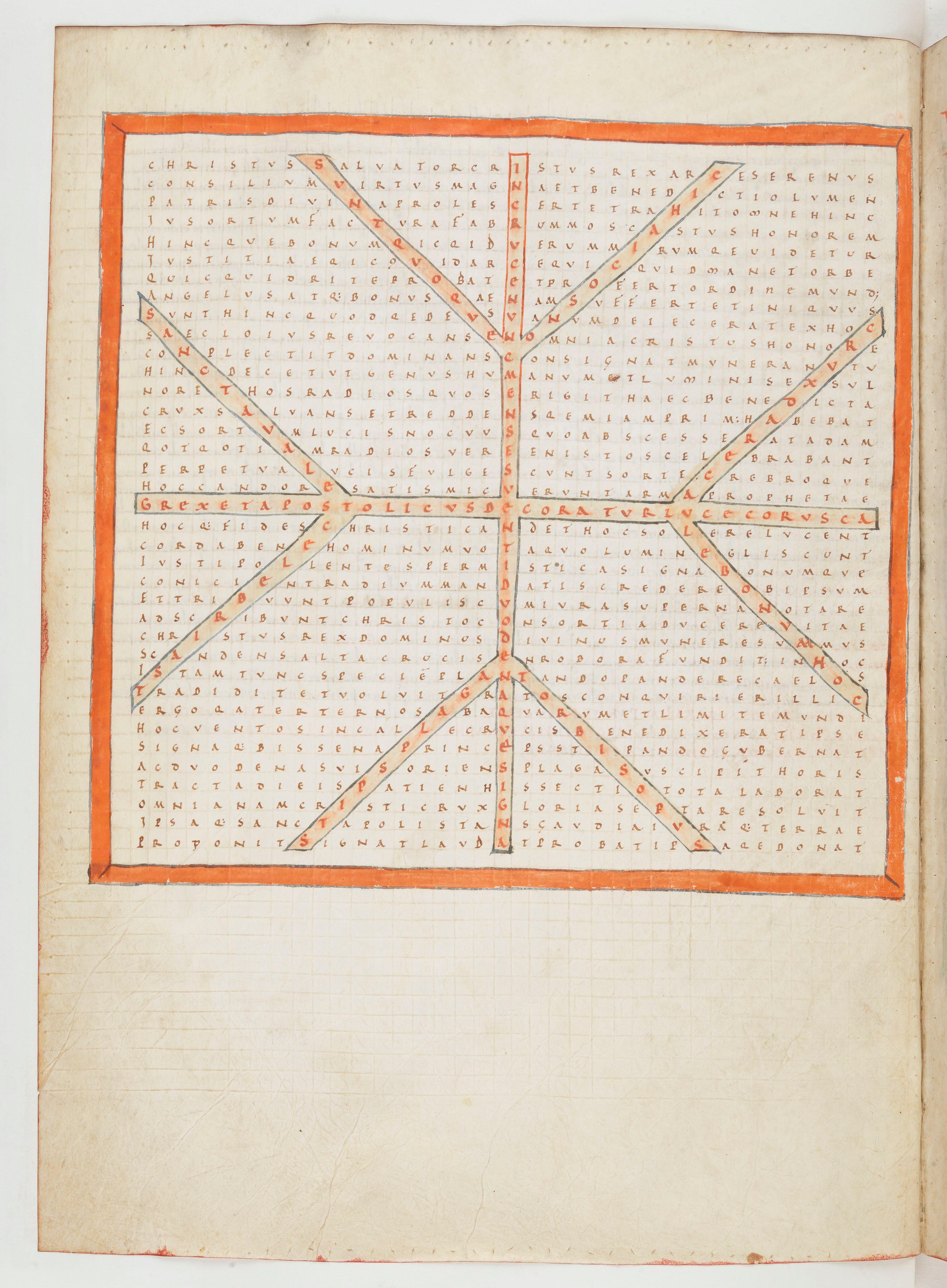 - Raban Maur, Louanges à la sainte croix, Croix, symbole de la création (nombre 12), Paris, BnF Latin 2421, f.11v - orange - Couche colorée - couche picturale