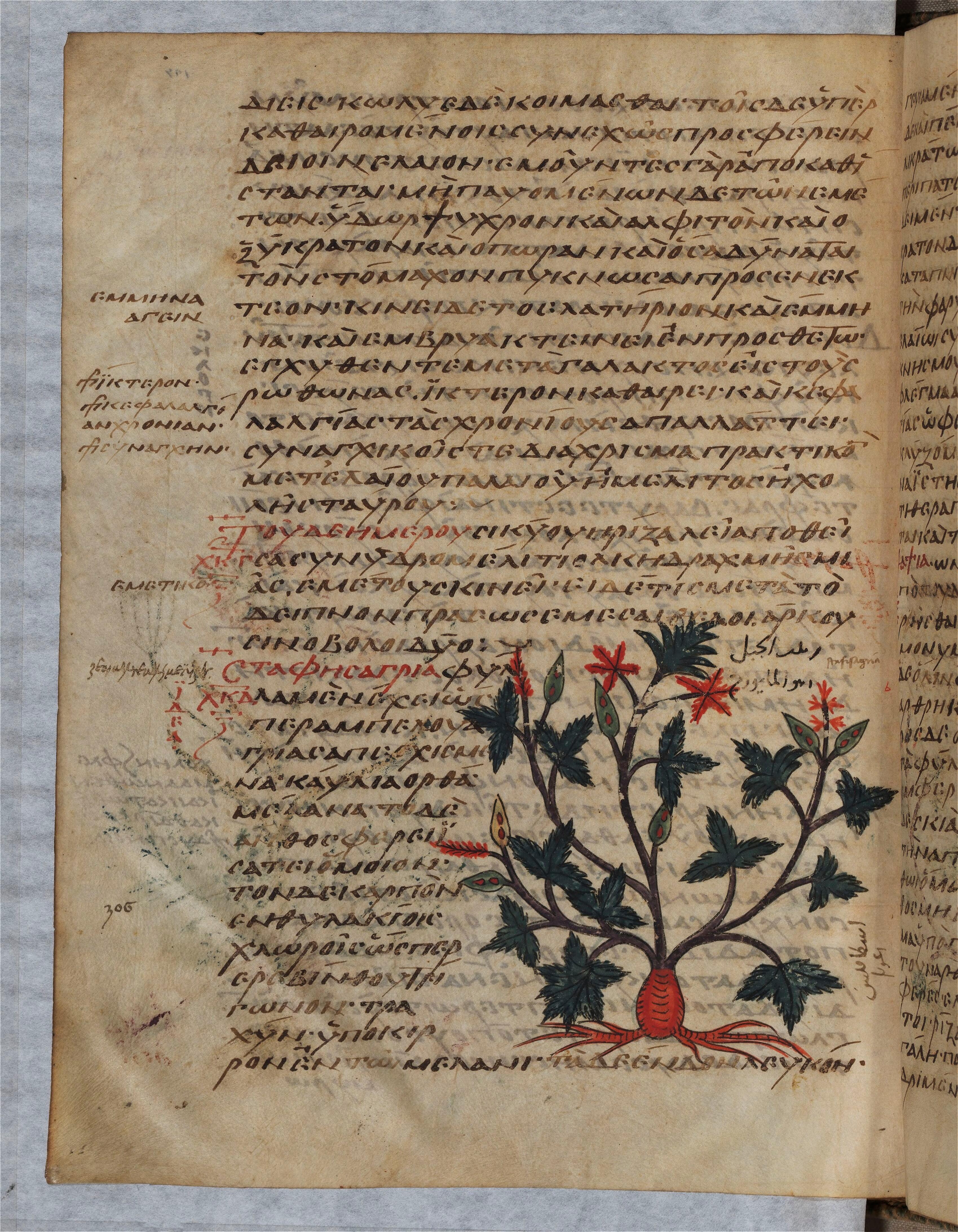 - Dioscoride, De Materia medica, staphisaigre, Paris, BnF, ms. grec 2179, f. 127v, manuscrit (9e siècle - )