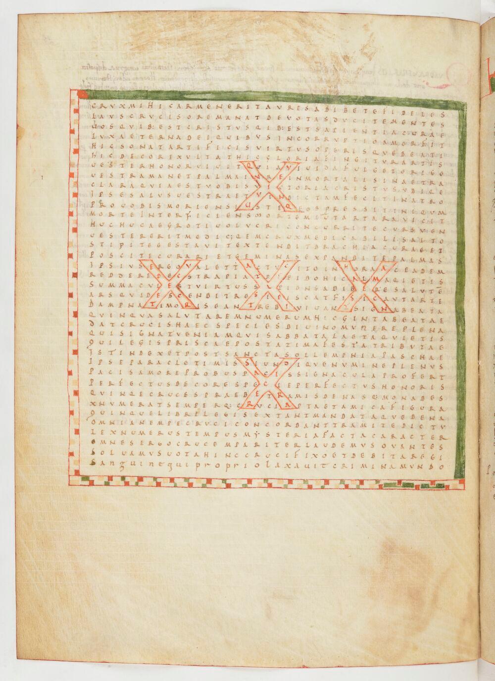 - Abbaye de Fulda Vers 650 - 1791, copié d'après, Raban Maur, Louanges à la sainte croix, Croix, symbole de l'observance de la loi, Paris, BnF Latin 2421, f. 22v, enluminure (3e quart du 10e siècle - 1er quart du 11e siècle)