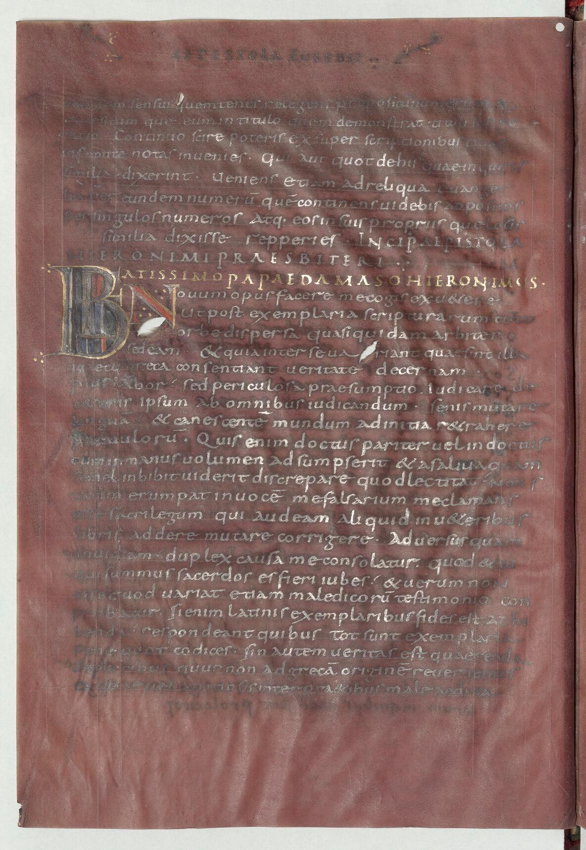 - Evangiles dits de Saint-Denis, Initiale B, Paris, BnF, Latin 9387, f.3v - orange - Décor - écriture manuscrite