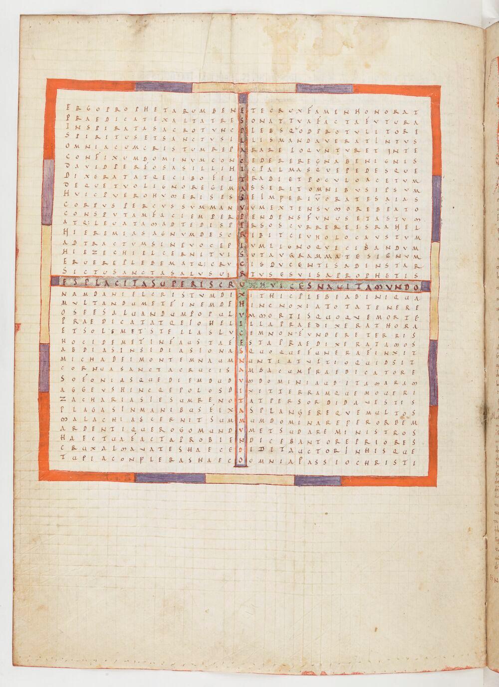 - Raban Maur, Louanges à la sainte croix, Croix, symbole des prophéties messianiques, Paris, BnF Latin 2421, f.29v - orange - Couche colorée - couche picturale