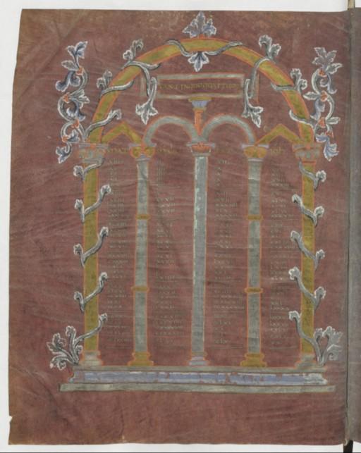 - Evangiles dits de Metz, Canon du Nouveau Testament, Paris, BnF, Latin 9383, f.2v, enluminure (845 - 855)