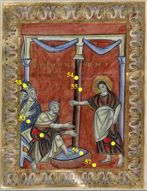 - Évangéliaire de l'abbaye de Poussay, Le lavement des pieds, Paris, BnF, ms. Latin 10514, f. 46v