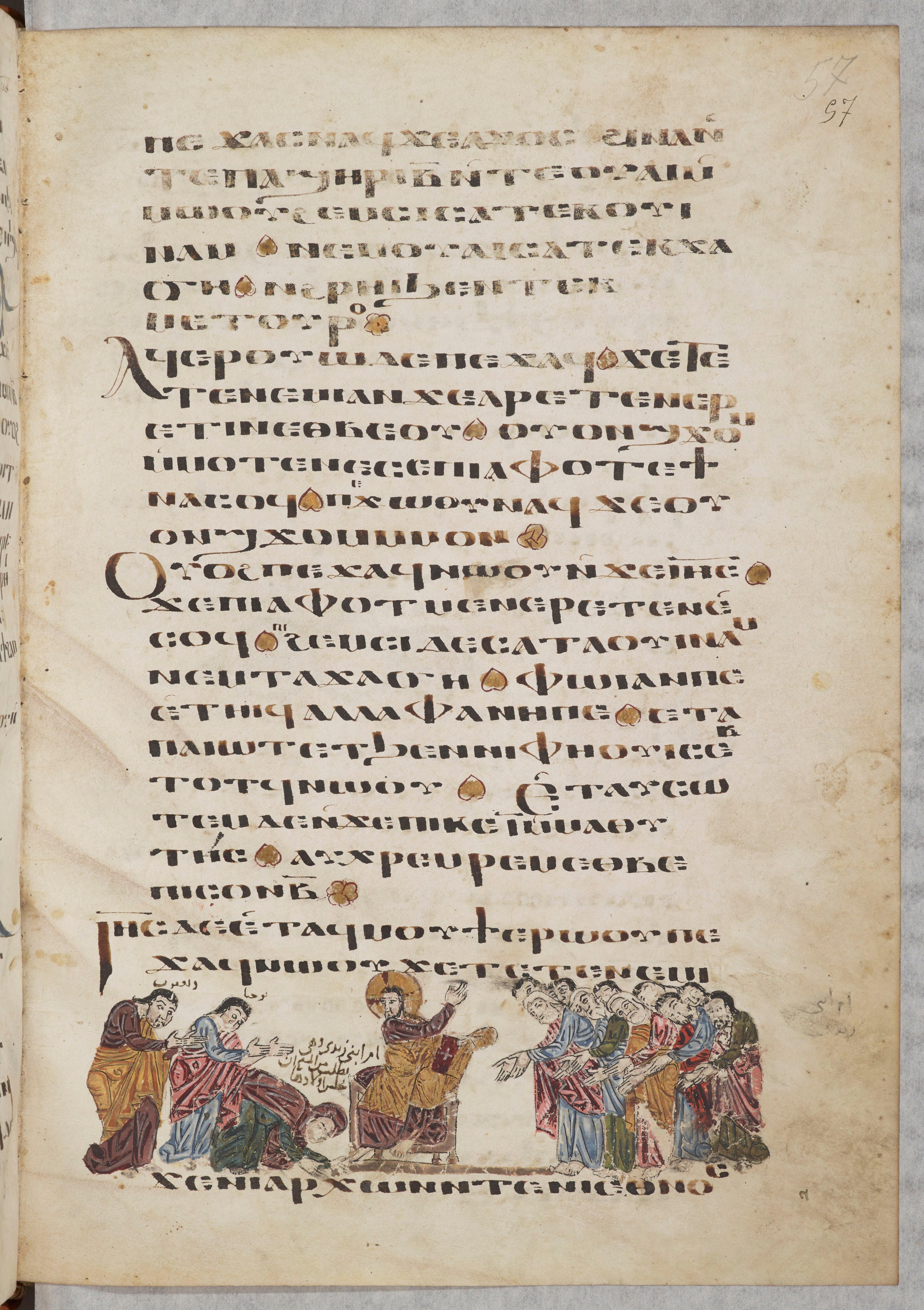 Tétraévangile copte, Guérison de la femme courbée, Paris, BnF, ms. Copte 13, f. 57r