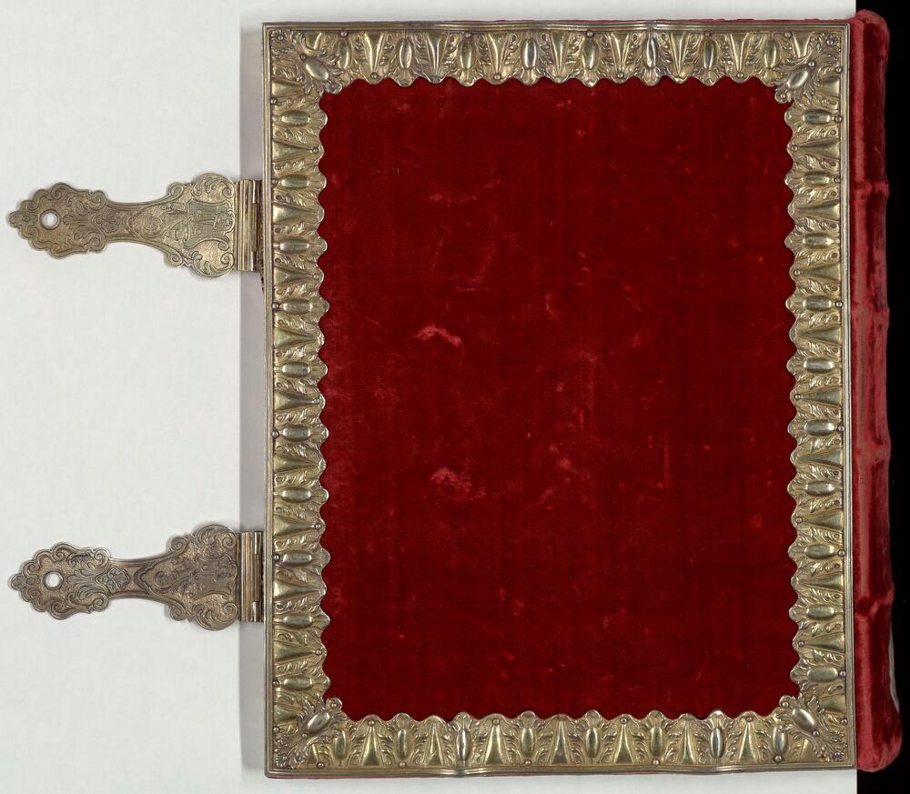 - Reliure velours rouge sur ais de bois XVIe s., refaite au XVIIIe s., puis restaurée;
