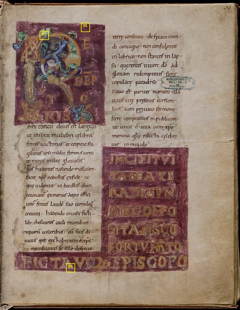 - Titre de l'enluminure sur f. 22r du manuscrit Vie de Sainte Radegonde de Fortunat.