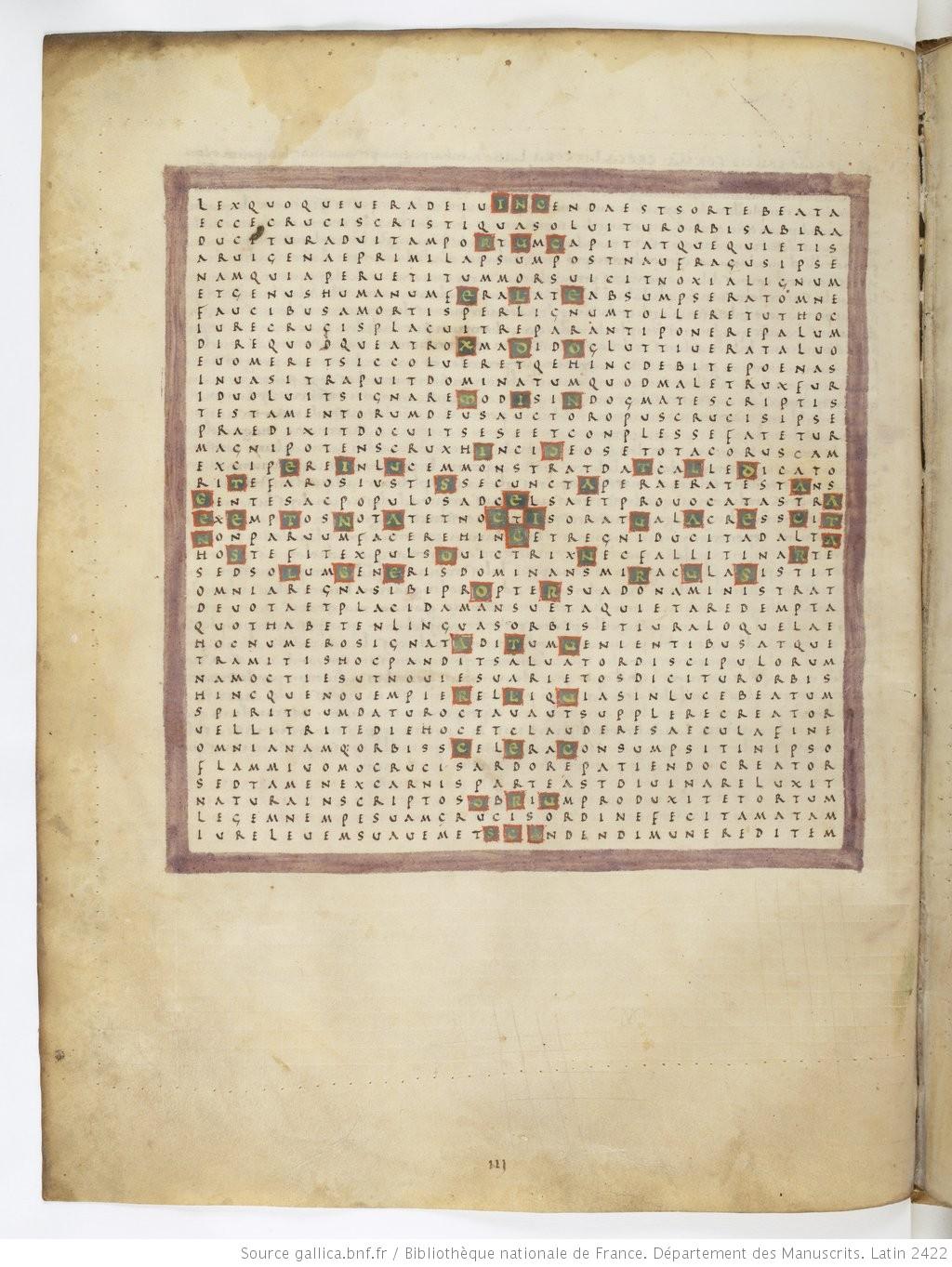 - Abbaye de Fulda Vers 650 - 1791, Raban Maur, Louanges à la sainte croix, Croix, symbole de la loi divine, Paris, BnF Latin 2422, f. 23v, manuscrit (Après 822 - Avant 845 / 847)