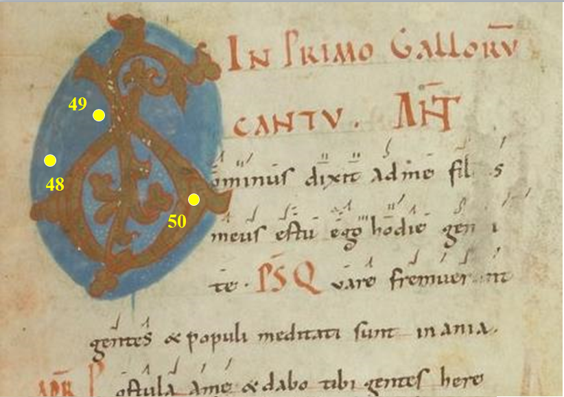- Graduel de l'abbaye de Prüm, Initiale ornée, Paris, BnF, ms. Latin 9448, f. 5r - doré - Couche colorée - couche picturale