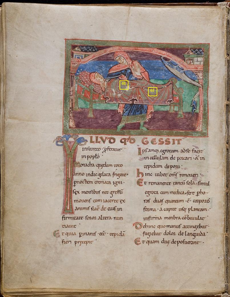 - Anonyme , Vie de Sainte Radegonde, Radegonde guérit une moniale alitée, Poitiers BM 250 (136), f. 35v, enluminure (Vers 1100 - )