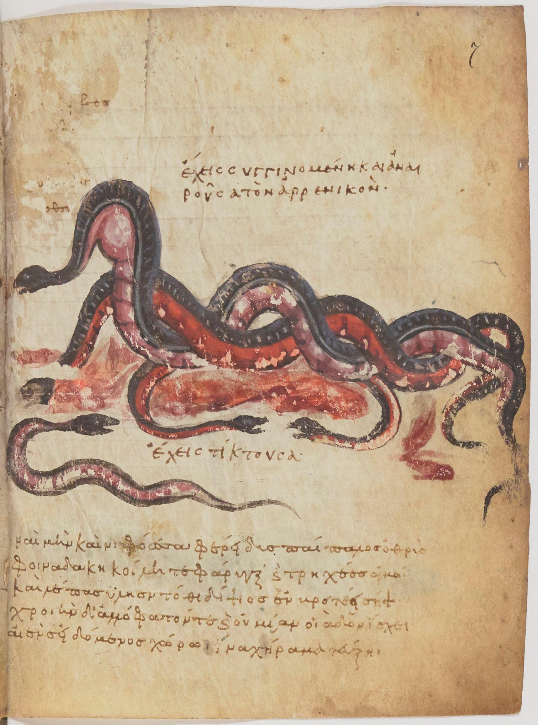 - Nicandre, Thériaques et Alexipharmaques, Accouplement et naissance des vipères, Paris, BnF, ms. supplément grec 247, f. 7r