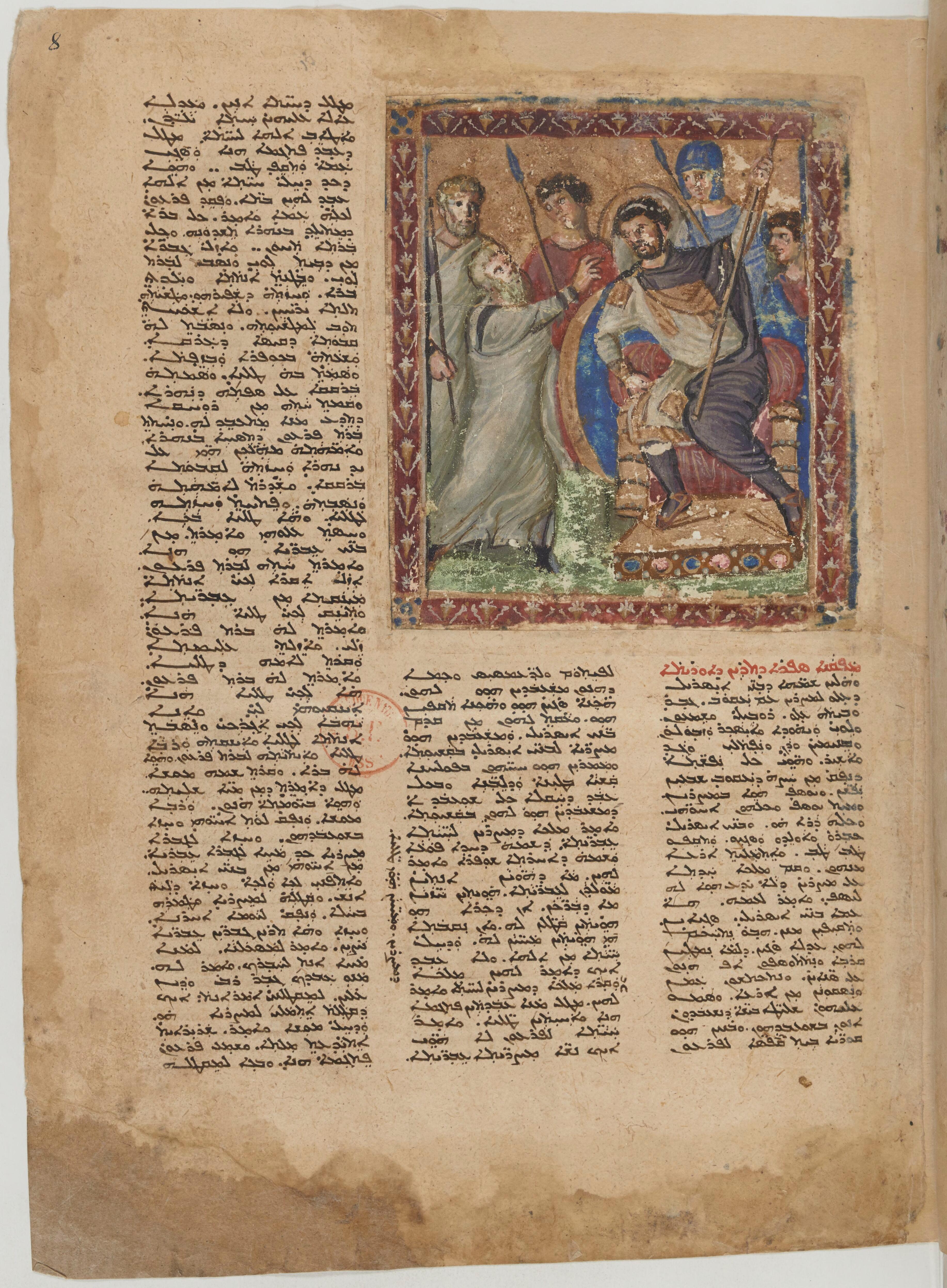 - La miniature peinte sur parchemin a été remontée à clair sur un feuillet de papier, dans un milieu syro-oriental ; l'écriture du 6e siècle demeure visible au verso de l'image.