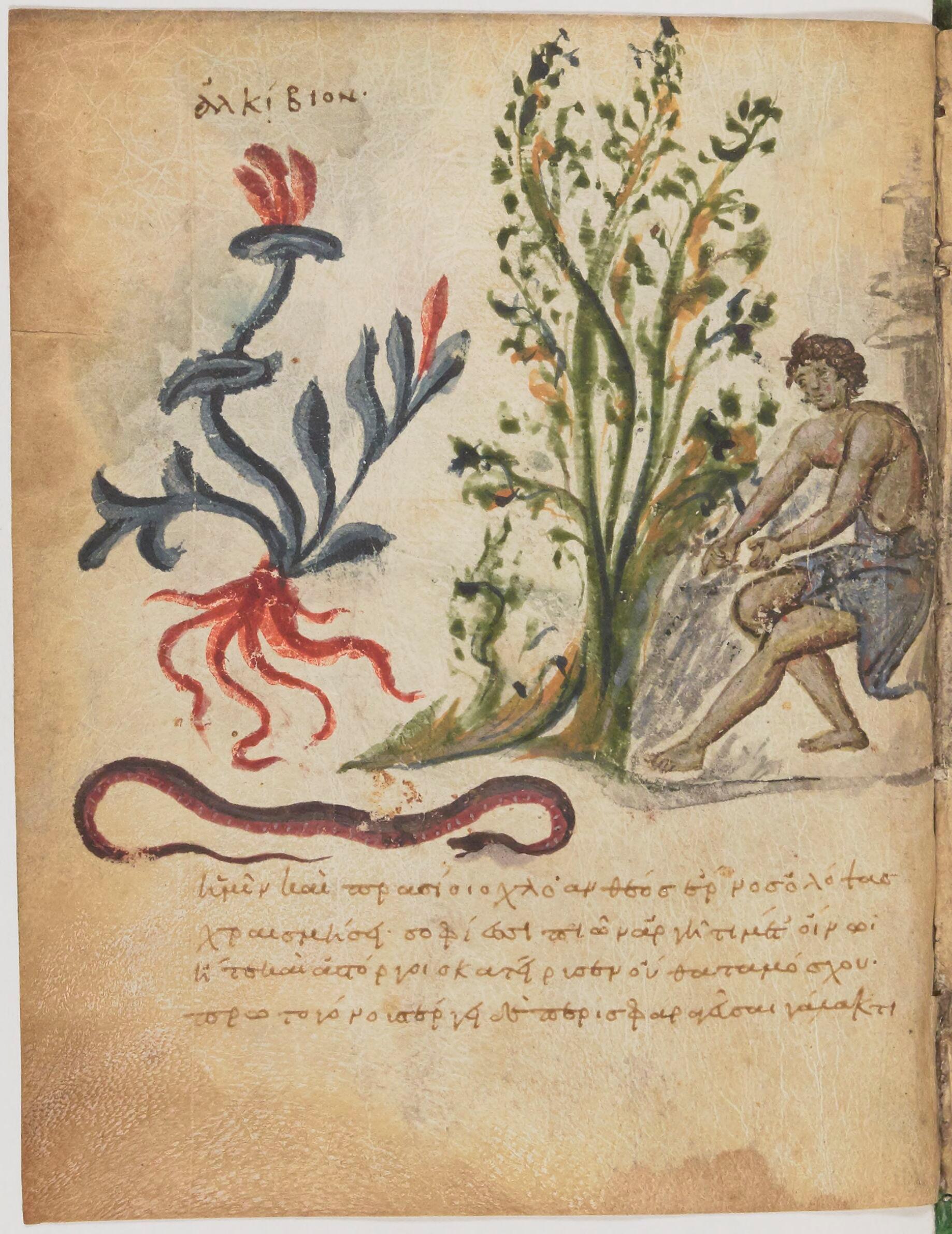 - Nicandre, Thériaques et Alexipharmaques, Alkibios découvrant les vertus de la buglosse, Paris, BnF, ms. supplément grec 247, f. 16v