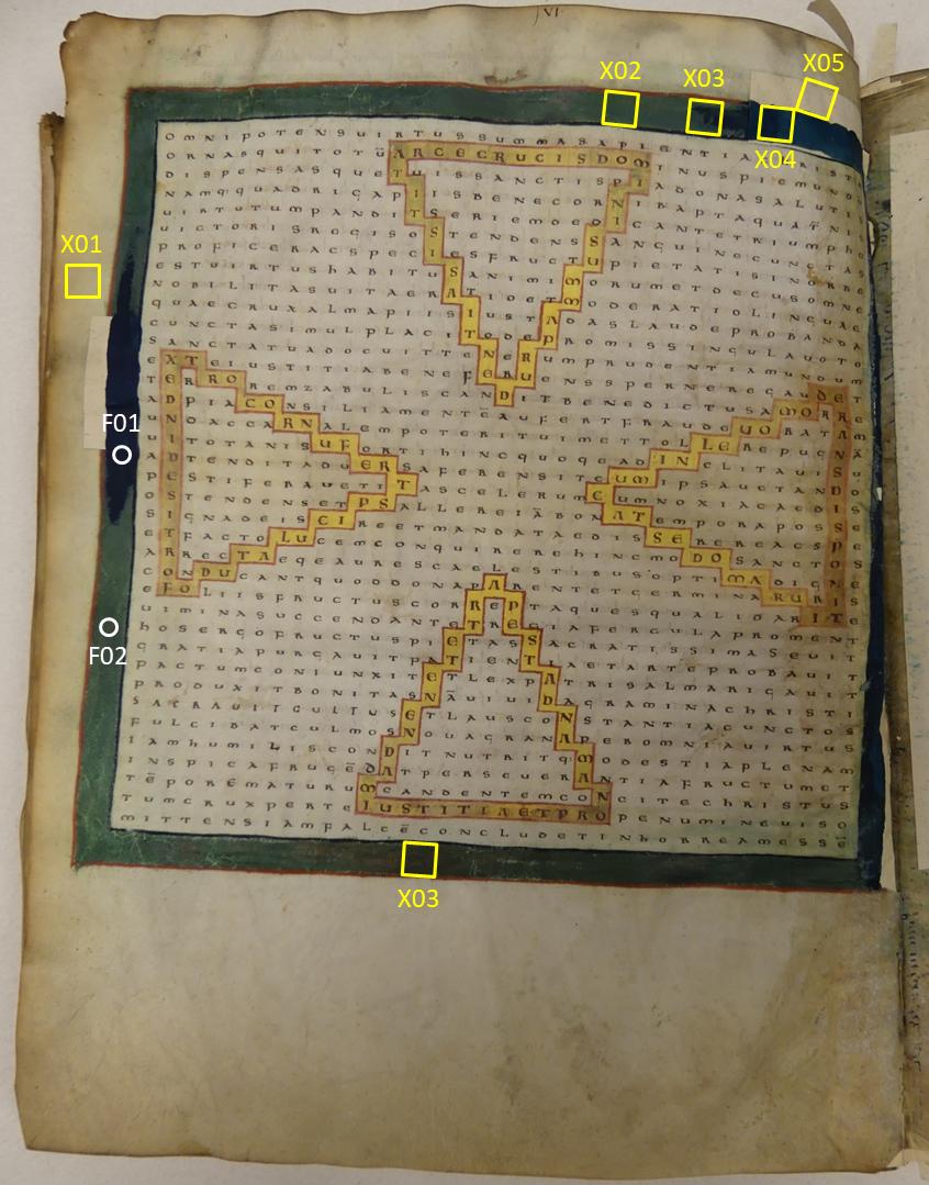 - Raban Maur, Louanges de la Sainte Croix, Croix, symbole des vertus, Paris, BnF, Latin 2423, f. 9v - vert - Couche colorée - couche picturale