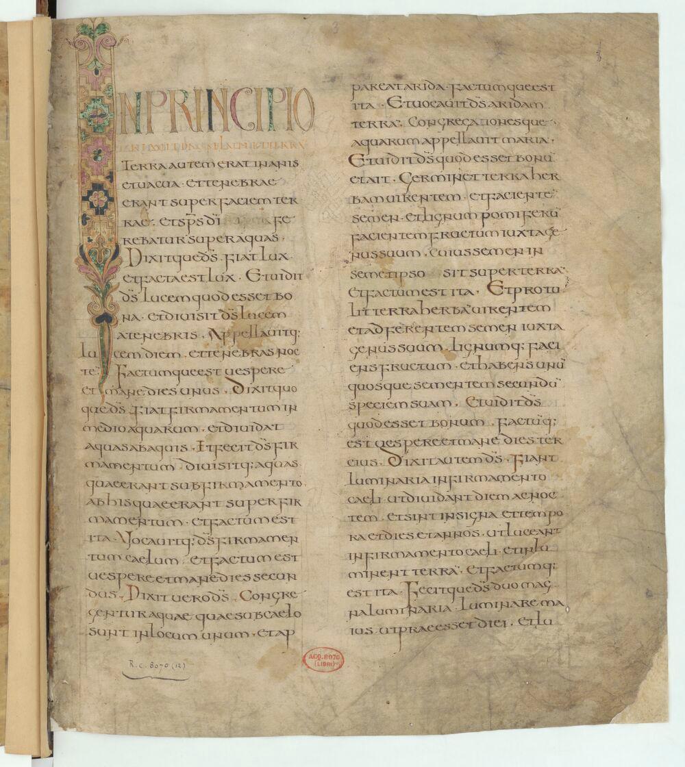 - Pentateuque dit d’Ashburnham ou de Tours, Lettre ornée pour la Création du monde, Paris, BnF, NAL 2334, f.3r - vert - Écriture - écriture manuscrite