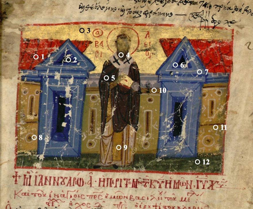 - Ménée de janvier, saint Basile, Paris, BnF, ms. grec 1561, f. 1r - doré - Couche colorée - couche picturale