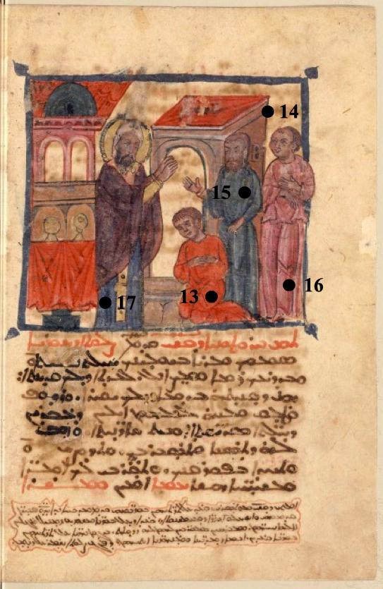 - Le manuscrit pourrait avoir été exécuté à Antioche, à la demande du patriarcheʾIgnatios II Dawīd (fct. 1222-1252). Ce dernier l'aurait emporté avec lui à Hṙomkla, où il seréfugia en 1247 auprès du catholicos arménien Kostandin Ier Bardzabertsi (fct. 1221-1267)858. À la mort du patriarche en 1252, le manuscrit serait passé à la cathédrale de Mélitène, voisine de Hṙomkla, ce qui expliquerait les nombreuses annotations relatives aux ordinations célébrées dans cette église, que l’on relève dans les marges.