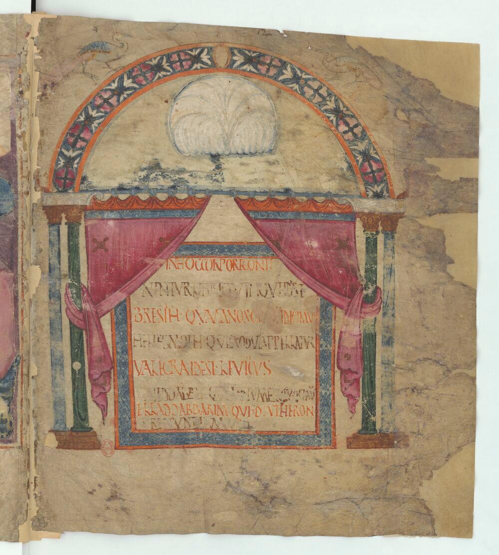 - Pentateuque dit d’Ashburnham ou de Tours, Portique de la Genèse, Paris, BnF, NAL 2334, f.2r, enluminure (4e quart du 6e siècle - 8e siècle)
